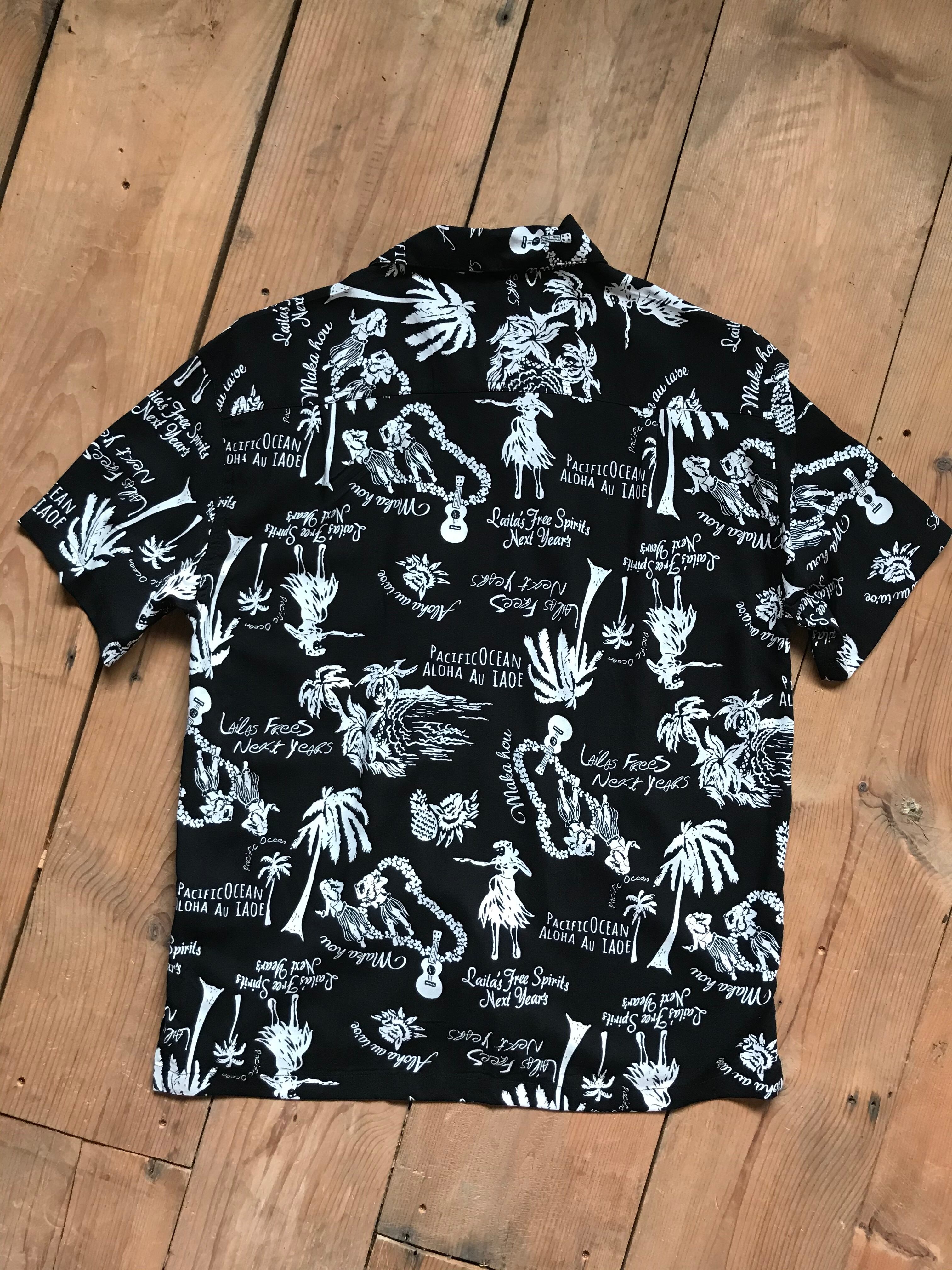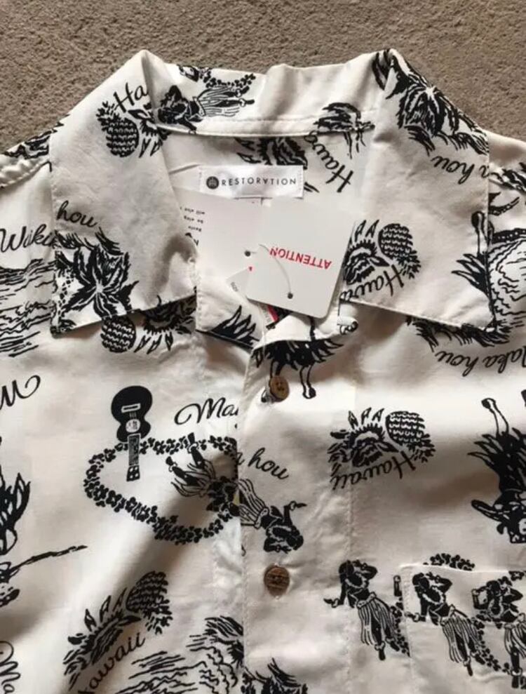 シックで落ち着いた感じを残しつつ夏らしい柄が全面に入り、衿はラフで大人な雰囲気のオープンカラー。しっかり首元まで締められるよう布ループが付き一番上のボタンを締めることにより開襟とは違う表情が可能。