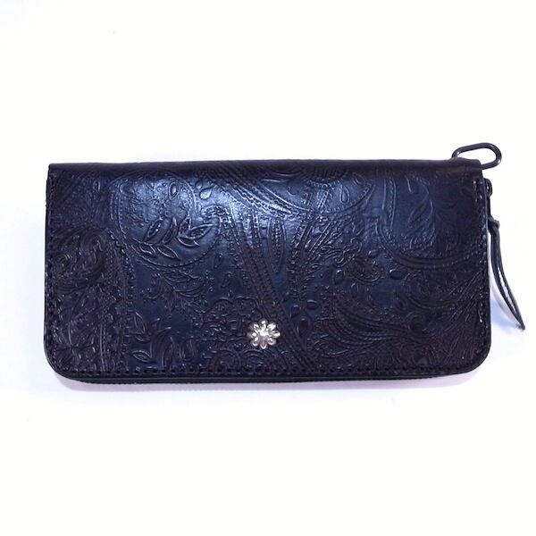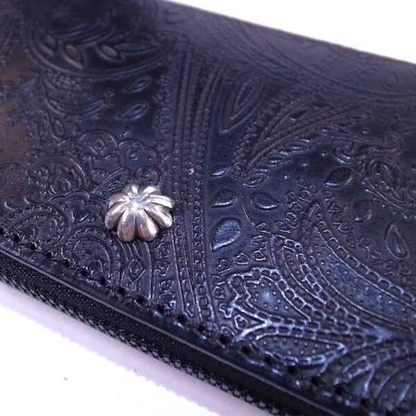 国産牛革の丈夫なヌメ革を使用し、オリジナルカラーは熟練の職人による手間を惜しまず手染め仕上げ施しペイズリー柄を落とし込んだロングウォレット。