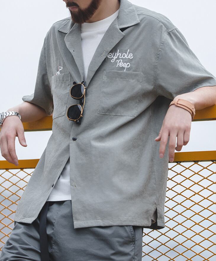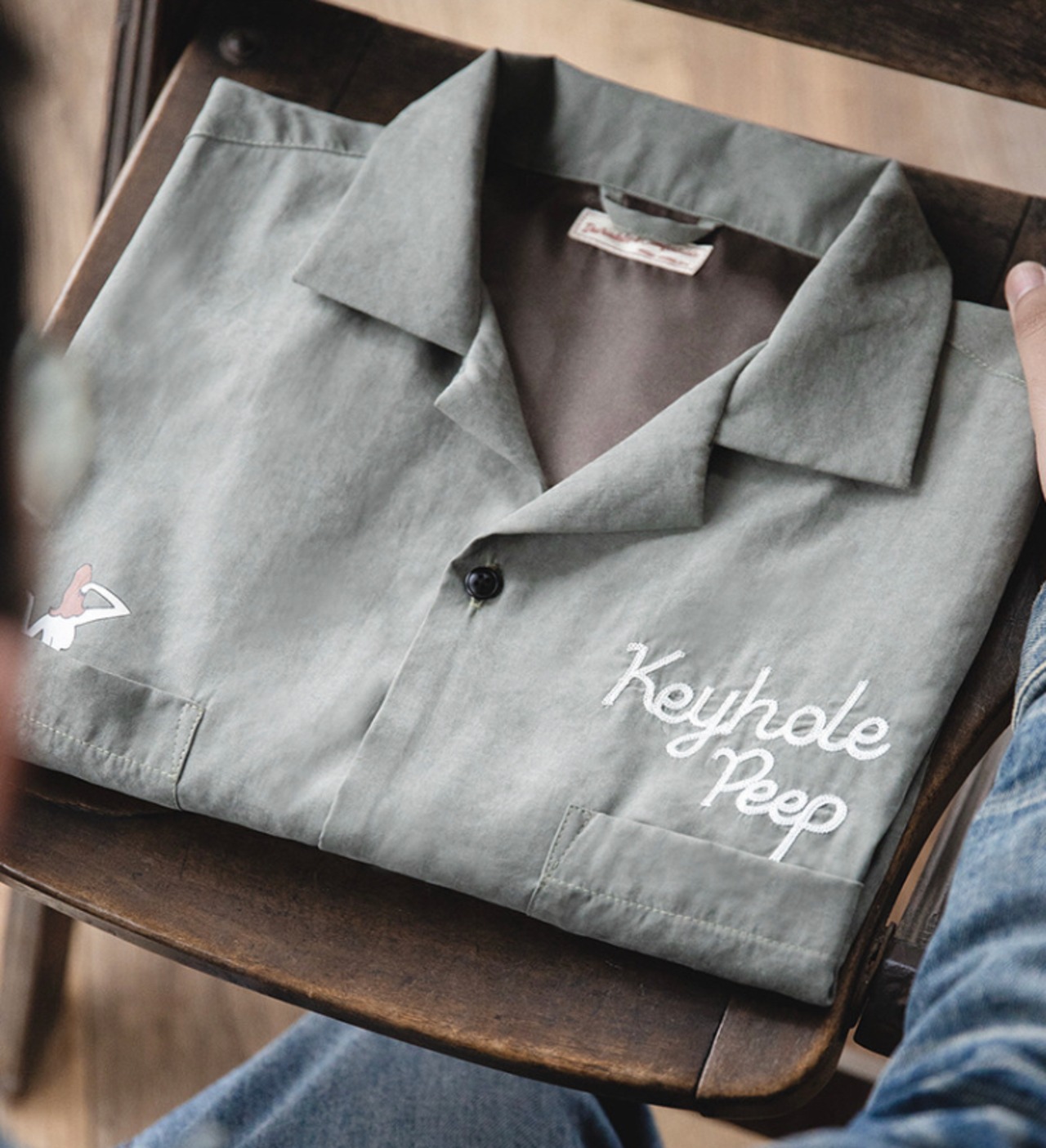 程よくぬけ感がたまらない半袖オープンカラーシャツ。右胸ポケットからのぞくポップなピンナップガールのデザイン。左胸にはヴィンテージ要素を取り入れたチェーンステッチを施した商品です。