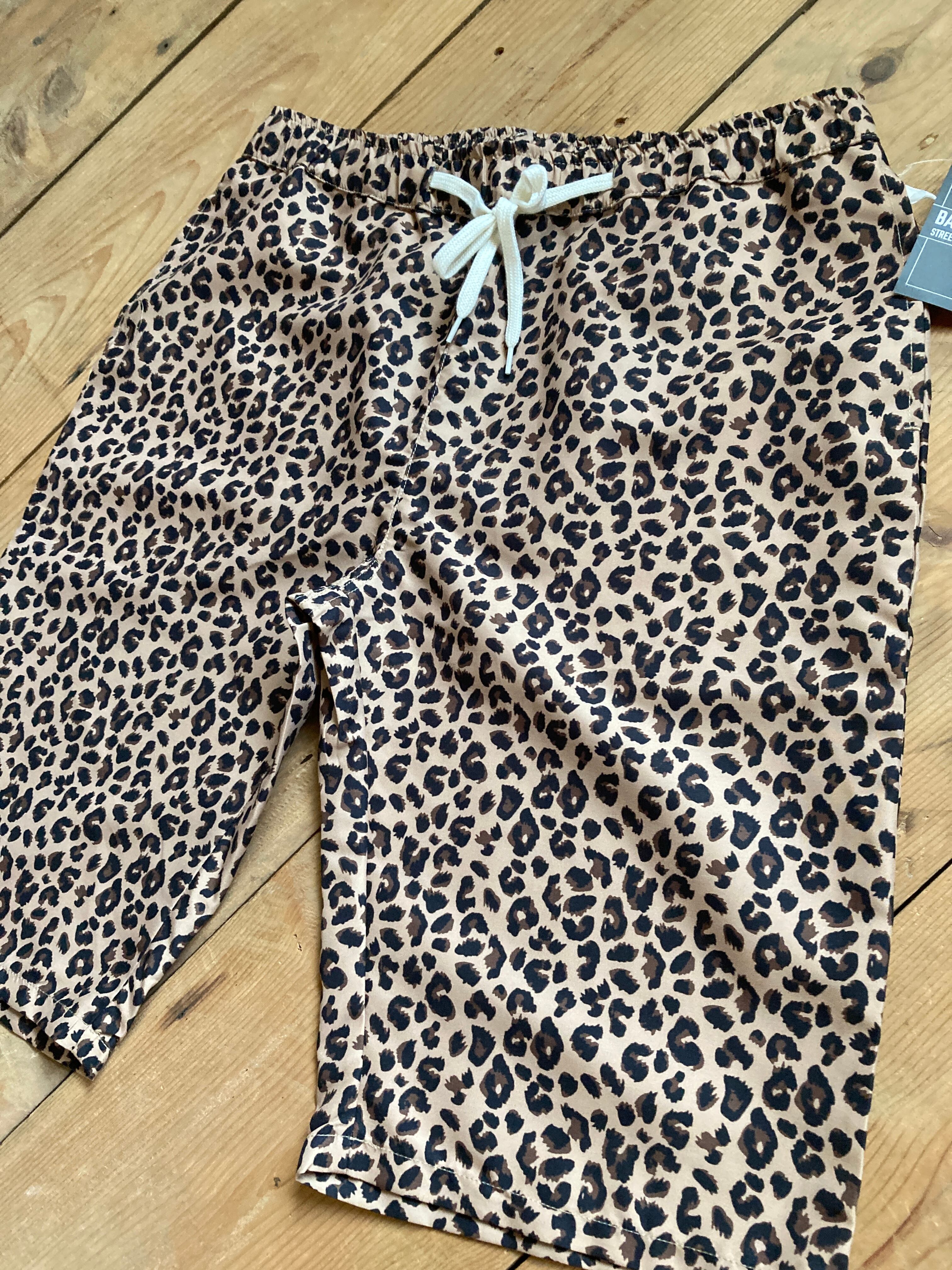 インパクトがありファッション性の高いヒョウ柄ハーフパンツ。ウエストはゴム&ヒモ。フロントポケット両脇左右にあり。